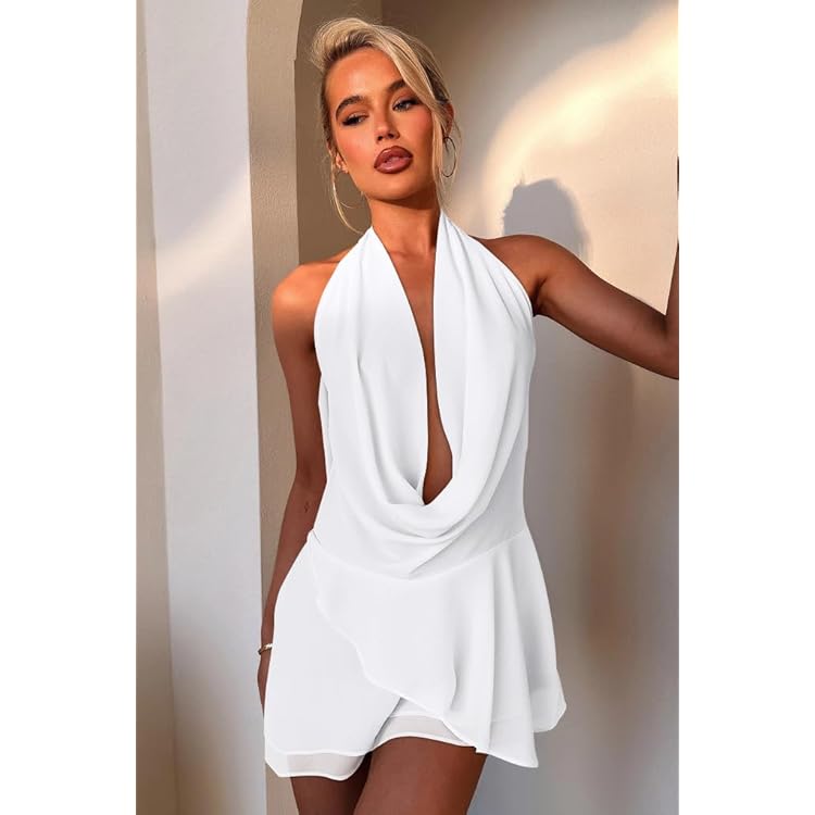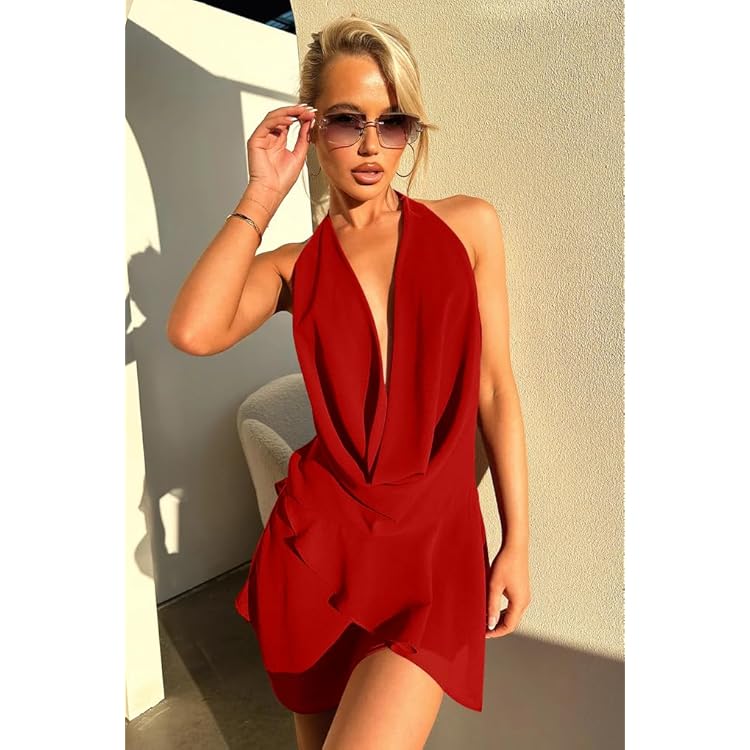 Women's Sexy Halter Plunge V Cowl Neck Low Open Back Irregular Ruffle Hem Mini Dress