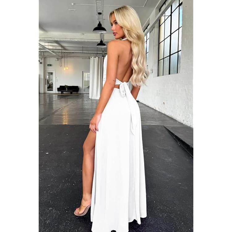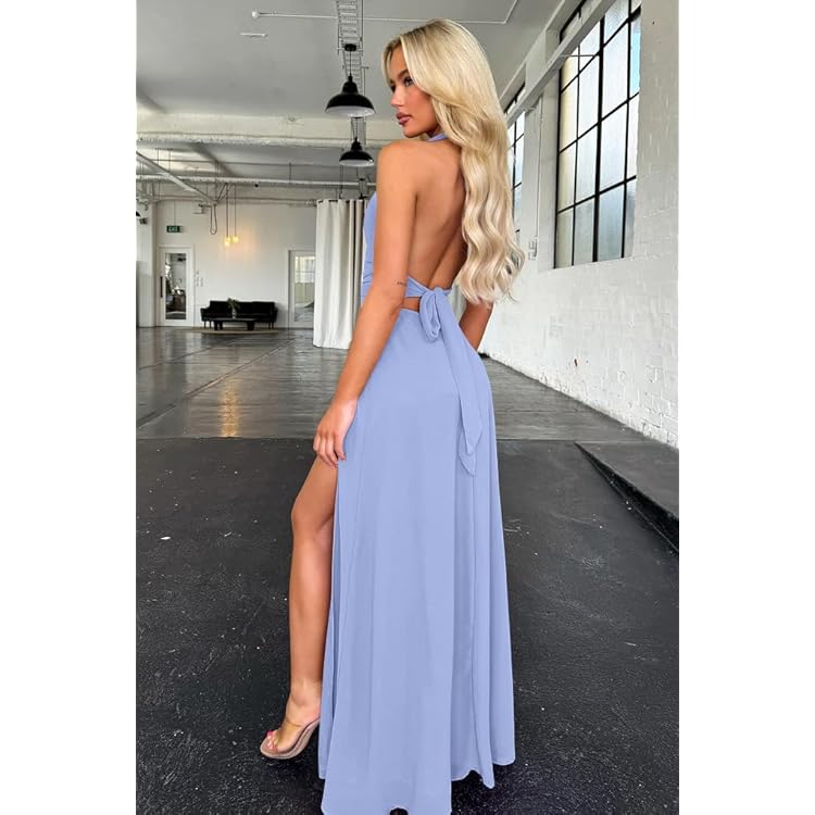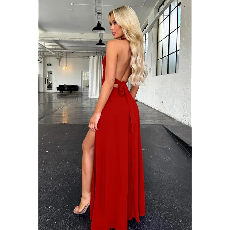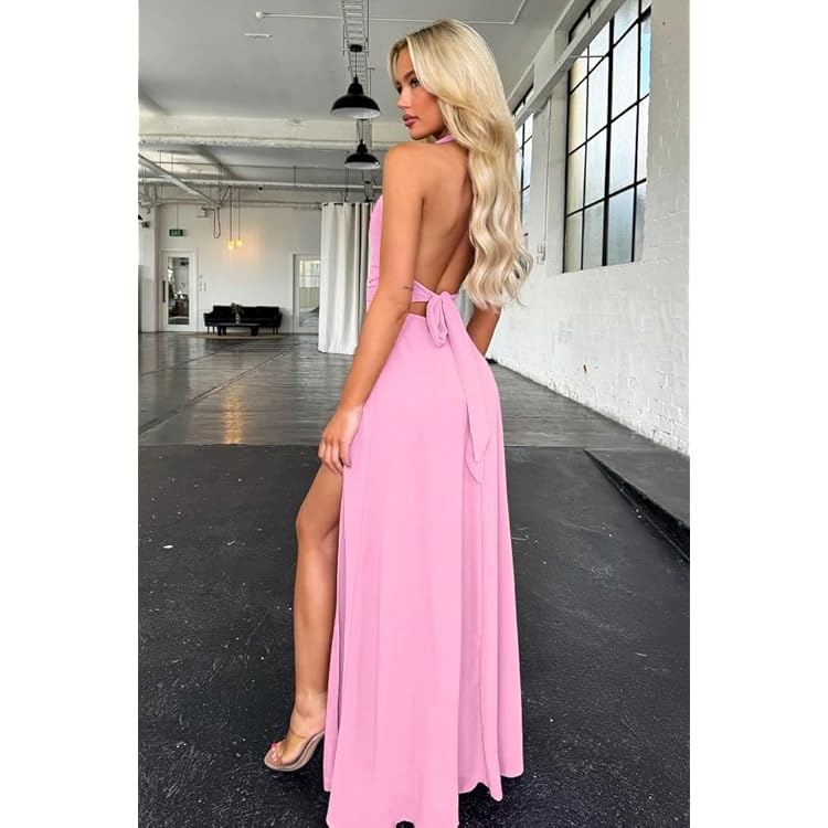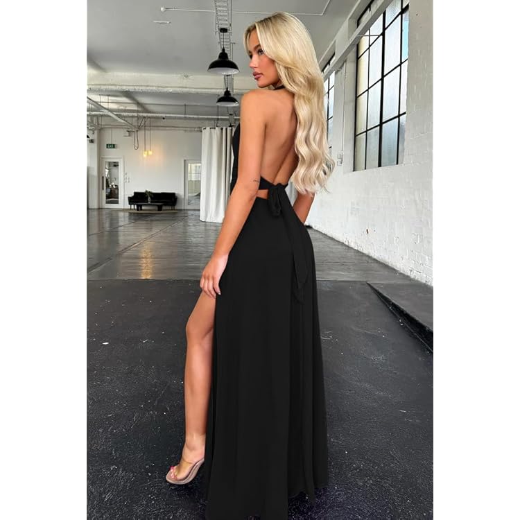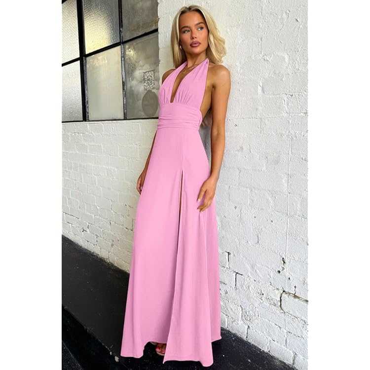 Women's Sexy Sleeveless Halter V Neck Ruched Waist Tie Back Side Split Long Maxi Dress