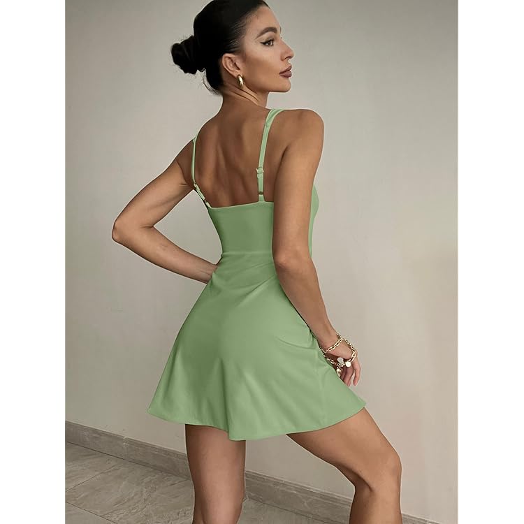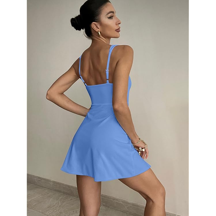 Women's Square Neck Sleeveless Bodycon Ruched Waist Flowy A-Line Ruffle Hem Mini Dress