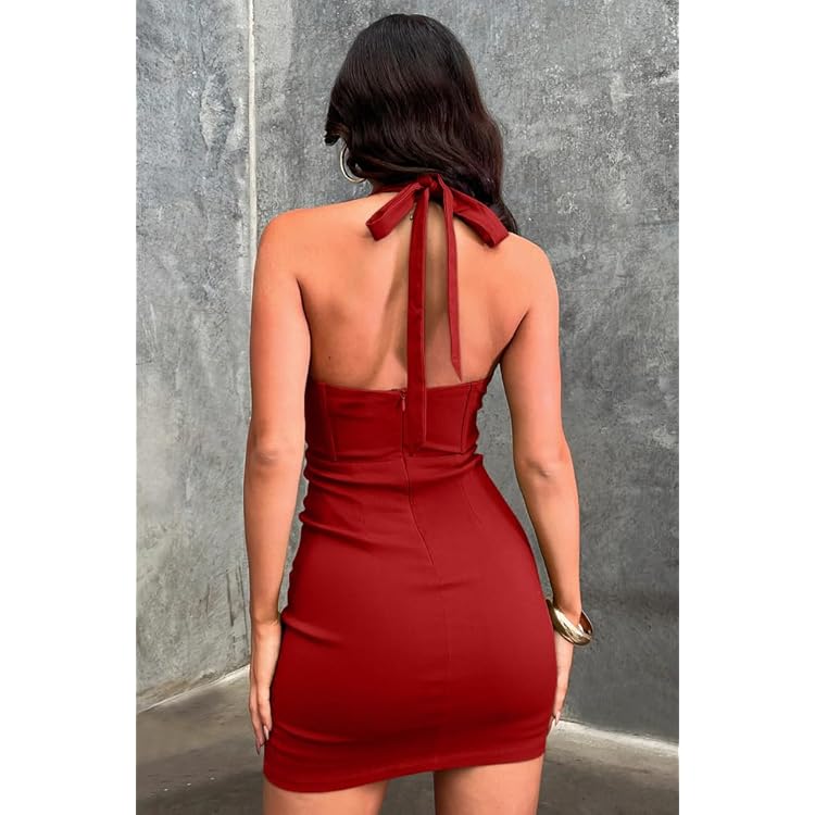 Women's Sexy Sleeveless Halter V Neck Bodycon High Waist with Boning Mini Dress